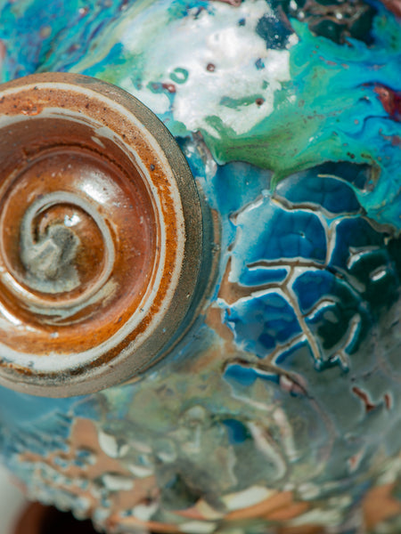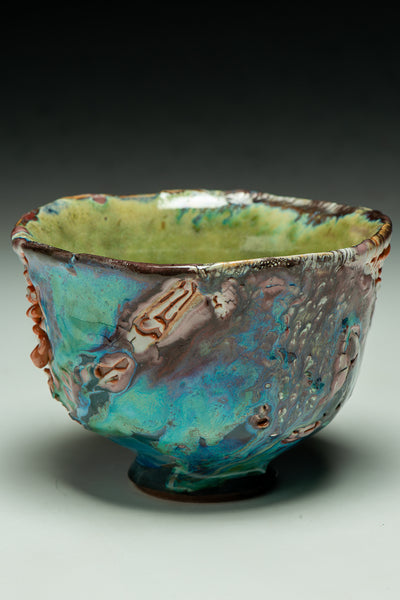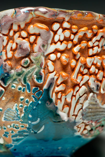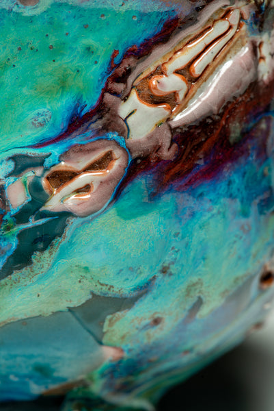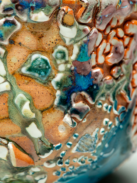 This Tea Bowl (chawan) measures 4 inches tall and 5.5 inches in diameter. I invite you to look deeply at the remarkable texture and complexity that Oni-glazing creates. I've continued to explore "Oni-Glazing" for the last three years. The complexity and elusiveness manage to delight and challenge me enough that I keep going.