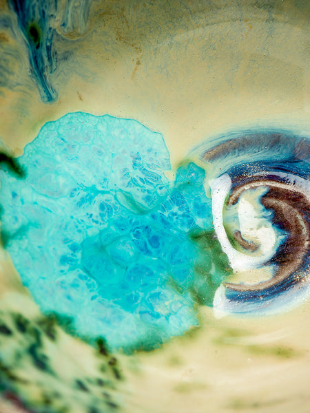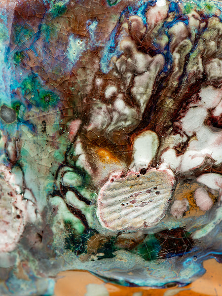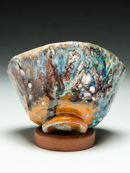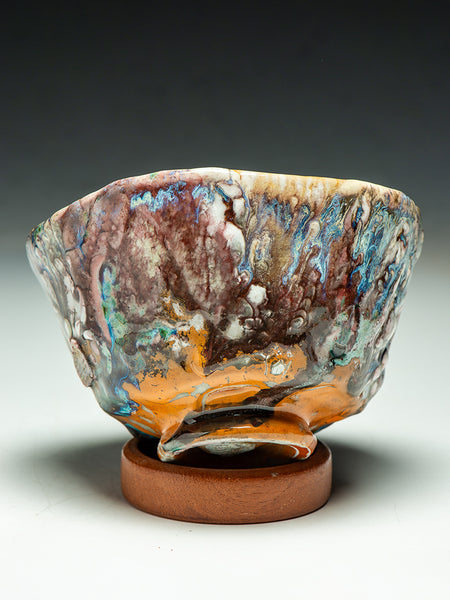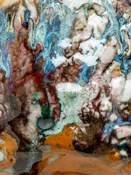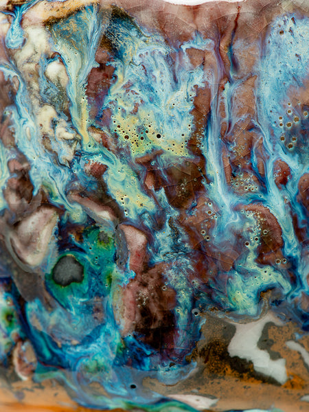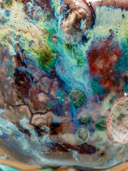 This Tea Bowl (chawan) measures 3.5 inches tall and 6.25 inches in diameter. I invite you to look deeply at the remarkable texture and complexity that Oni-glazing creates. I've continued to explore "Oni-Glazing" for the last three years. The complexity and elusiveness manage to delight and challenge me enough that I keep going.